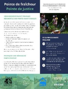 La CDC vise à rendre les actifs communautaires (habitations collectives et locaux communautaires) du quartier Pointe-Saint-Charles, Montréal, plus résilients face aux aléas socio-climatiques. Dans une perspective de justice sociale et environnementale et de lutte contre l’éco-gentrification, le projet vise à mobiliser et sensibiliser les locataires des habitations collectives, parmi les plus vulnérables, et les groupes communautaires, et à prioriser les interventions de verdissement et autres mesures d’amélioration de l’environnement au sein des habitations et bâtiments protégés de la spéculation.