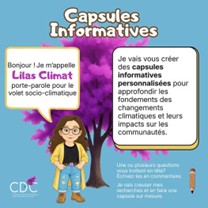La CDC de Mirabel accueille une porte-parole pour le volet socio‑climatique : Lilas Climat ! Passionnée par la recherche sur les changements climatiques, Lilas a pour mission de vulgariser, sensibiliser et informer sur les changements climatiques et leurs impacts sur les communautés, à travers des capsules accessibles et personnalisées.